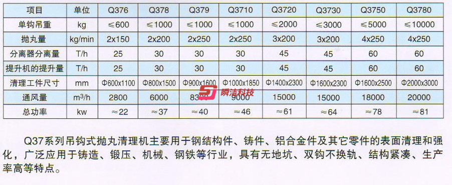 該系列型號(hào)拋丸機(jī)有Q374單吊鉤式拋丸機(jī)、Q376雙吊鉤式拋丸機(jī)、Q378雙吊鉤式拋丸機(jī)等。